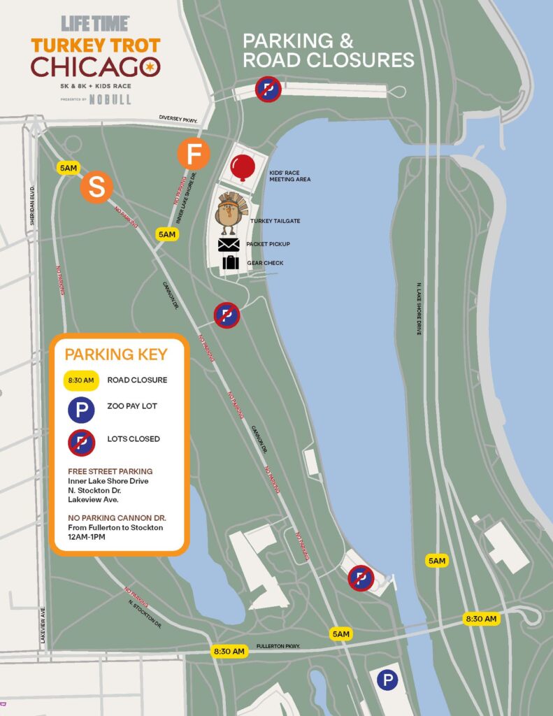 There will be limited race day parking available at the Lincoln Park Zoo pay lot, easily accessible at Fullerton Parkway, immediately west of Lake Shore Drive. This lot will fill quickly, on a first come, first served basis. More parking information can be found below.
